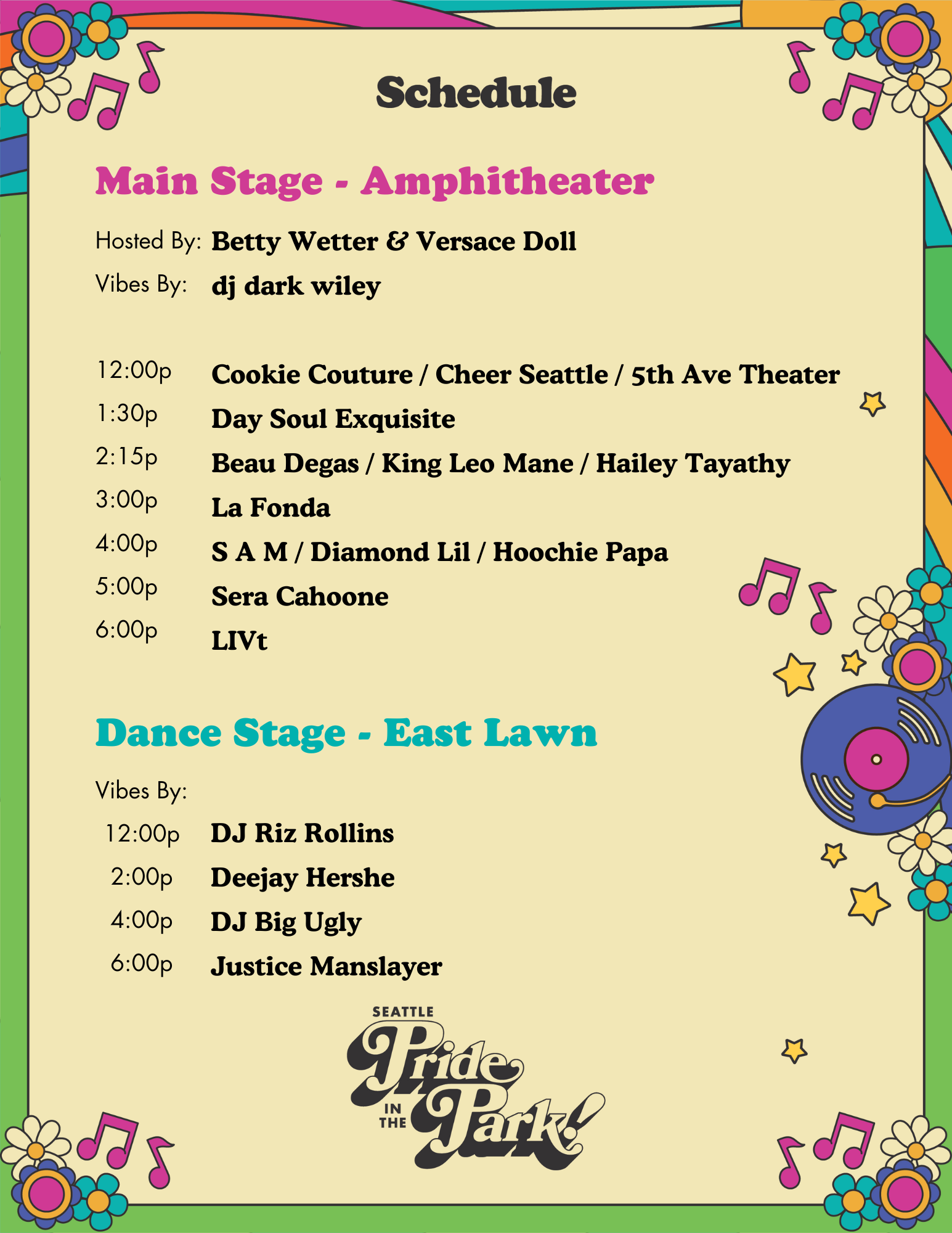 From 12pm - 7pm, Seattle Pride in the Park will feature a can’t-miss lineup of LGBTQIA+ performances, a dance-focused stage with an adjacent alcohol garden (21+), food trucks, local nonprofit booths, queer vendors, and more.